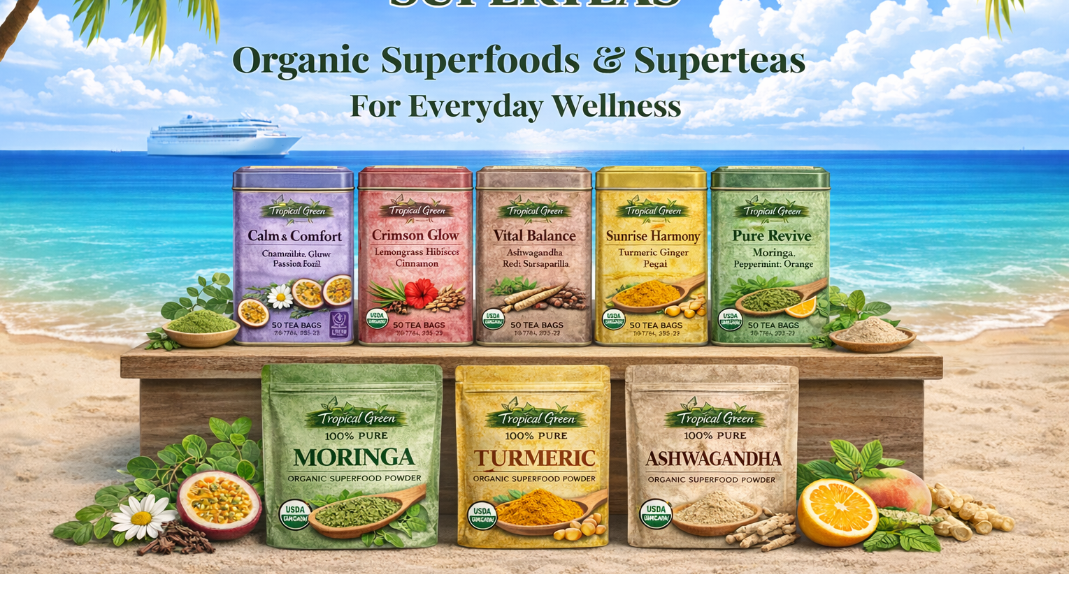 Tropical Green Organics is dedicated to crafting premium organic superfoods tea blends that support everyday wellness. Our products are thoughtfully formulated using high-quality, natural ingredients sourced from around the world, combining traditional herbal knowledge with modern lifestyles. From calming infusions to energizing blends, each tea is designed to promote balance, vitality, and a refreshing tropical experience in every cup.