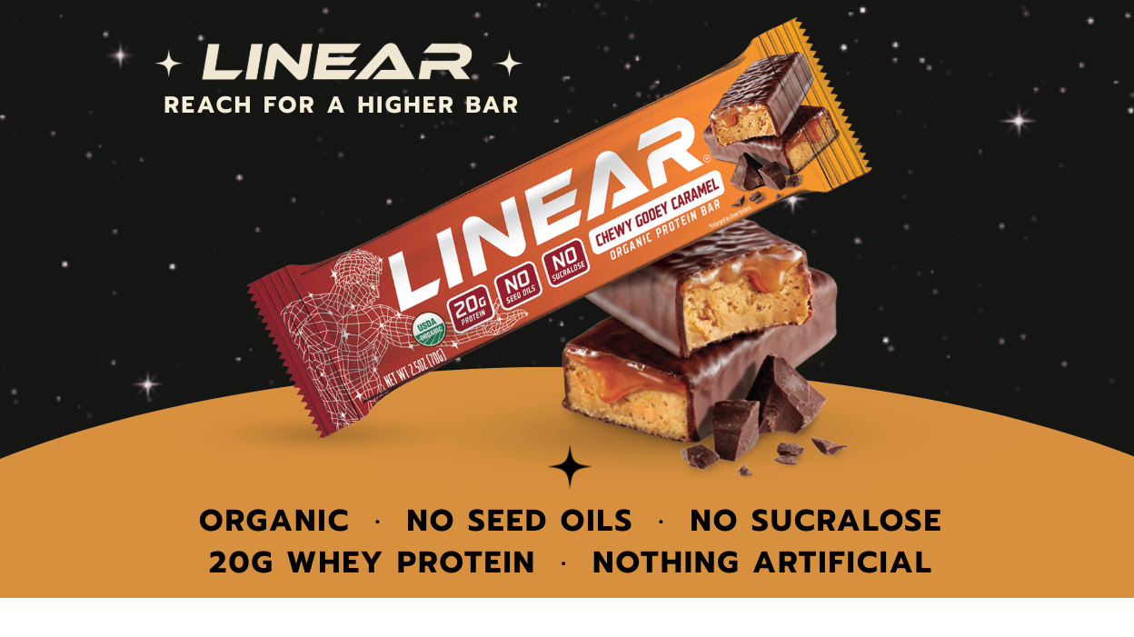 Linear Bar elevates the protein bar to a new realm of indulgence, serving up decadent dark chocolate, caramel, and chewy nougat made with carefully selected organic ingredients free of seed oils, sucralose, and chemical additives. Each bar supplies 20g of whey protein in a bar crafted to satisfy the fiercest sweet tooth and the most-discerning label-reader. Mouth-watering new flavors dropping in March. Reach for a Higher Bar.