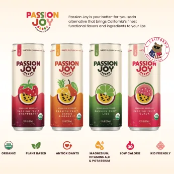 Passion Joy was founded with a clear mission: to create a refreshing, fruit-based alternative to traditional sugary sodas. Passion Joy is an organic soda made in California, known for its clean ingredients and refreshing tropical flavors.