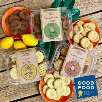 Wackym's Kitchen has many delicious crunchy cookies from which to choose. We use real butter, pure cane sugar, cage-free eggs, unbleached/unbromated flour, and non-aluminum baking powder. All of our treats are made from fresh ingredients with no artificial flavorings or preservatives. Our cookies have a crisp and crunchy texture with a "fresh out of the oven" taste. What's in the kitchen? We offer you twelve everyday cookie varieties, four shortbread varieties, and our savory Hatch Cheese Nibbles as well as seasonal choices.